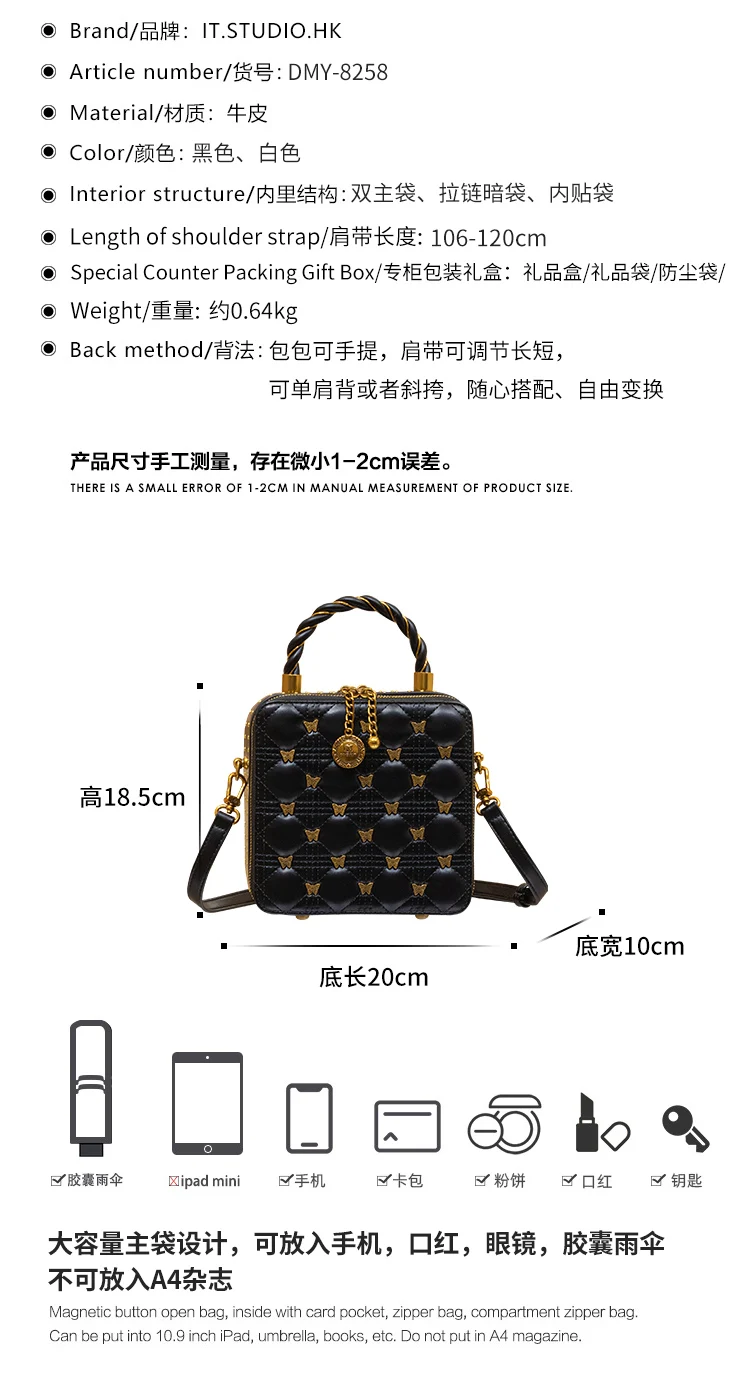 The bag features a fashionable small square design that effortlessly combines practicality and panache. It measures the ideal size for all your essentials, making it versatile for any occasion, be it a casual day out, a business meeting, or a chic evening gathering. With a soft hardness and luxury feel, this handbag will elevate any outfit, making you the center of attention!